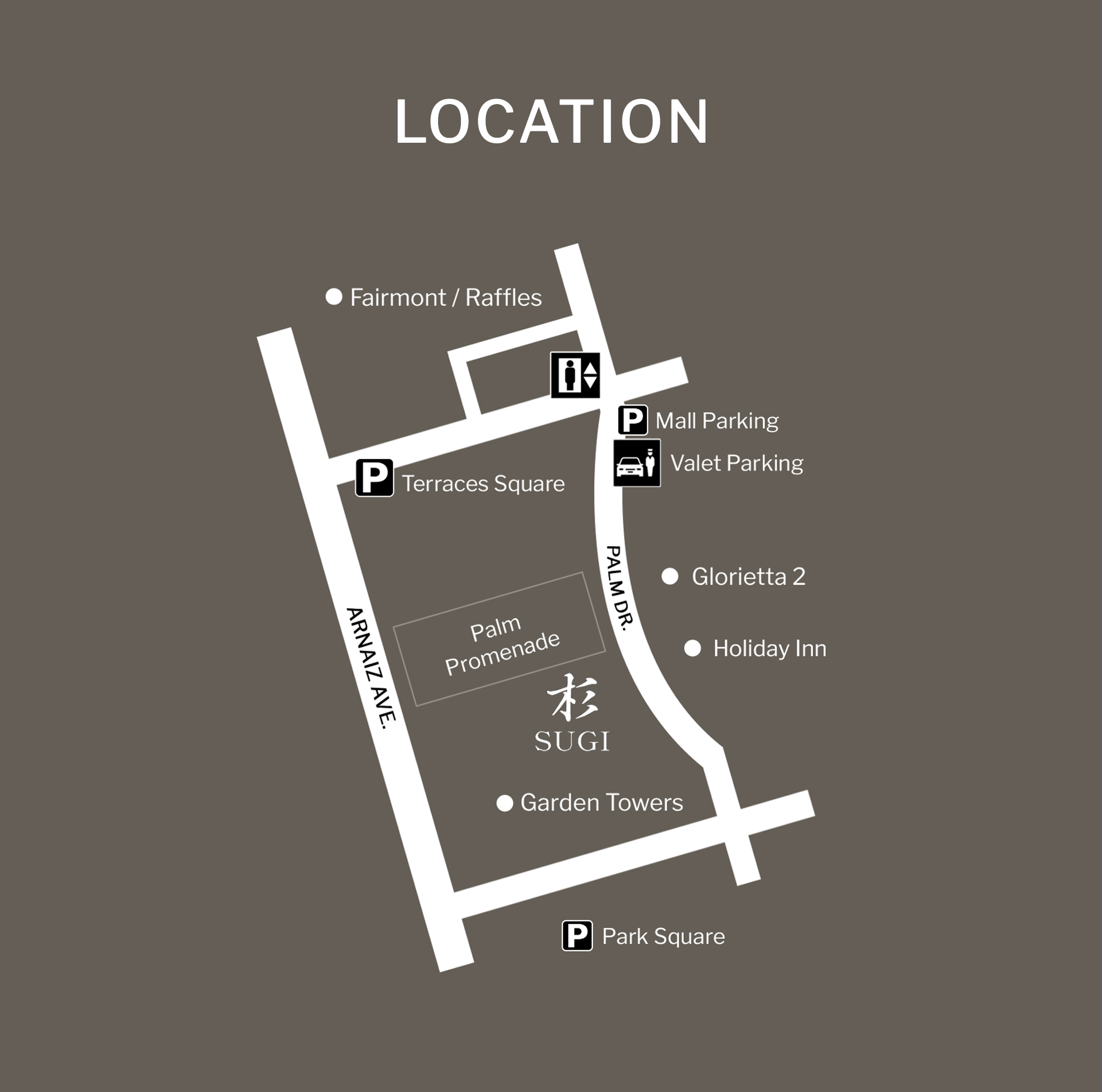 Nearest option is basement parking of Glorietta 2. Sugi is located just across the main entrance of the mall.